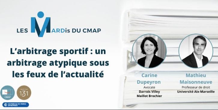 Dans le cadre des MARDis du CMAP, Carine Dupeyron, avocate associée du cabinet Darrois Villey Maillot Brochier, co-dirigeante de la pratique d’arbitrage international et Membre du Tribunal arbitral du sport, et Mathieu Maisonneuve, Professeur de droit public à Aix-Marseille Université, Membre du Tribunal arbitral du sport et Conciliateur au Comité National Olympique et Sportif Français (CNOSF), ont échangé pour éclairer les enjeux d’un mode de règlement des différends devenu incontournable dans le monde du sport.