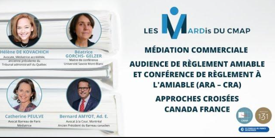 Le mardi 30 janvier, dans le cadre des MARDis du CMAP, Me Hélène de Kovachich, Avocate, Médiatrice accréditée, ancienne présidente du Tribunal administratif du Québec, Beatrice Gorchs-Gelzer, Maître de conférences à l’Université Savoie Mont Blanc, co-responsable du DU Modes amiables de règlement des différends, Bernard Amyot, Avocat au Barreau de Montréal ...